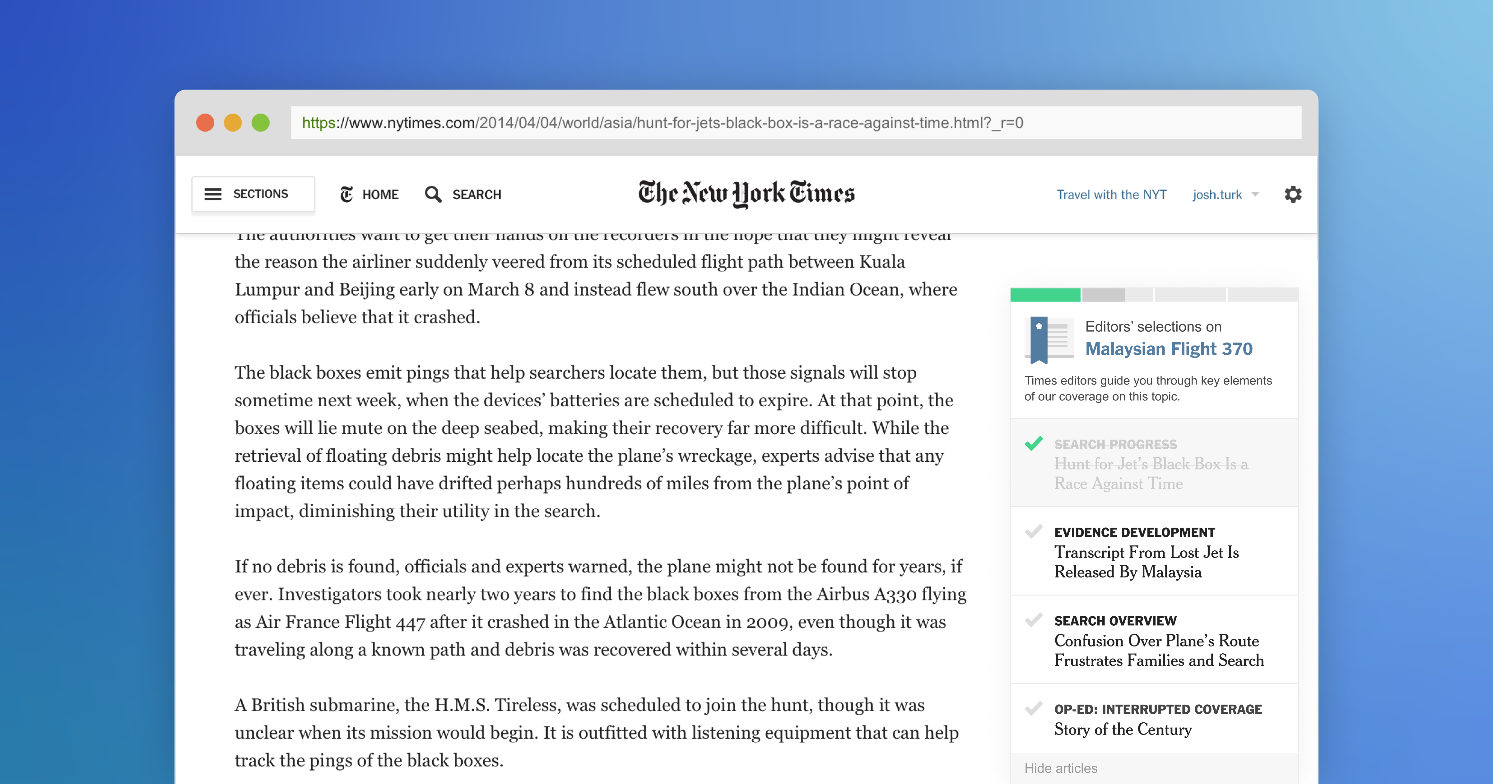 At the time, non-subscribers operated under a metered paywall, so we had to account for the possibility that users would be reluctant to spend multiple page views on a single topic. The solution also had to coexist with the existing reading experience without disrupting normal behavior.